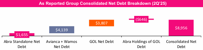Abra has c. $9.3 billion in revenues, c. $2.5 billion in EBITDAR, and 318 aircraft with 69 million passengers (of which 43 million are loyalty members). With $9.0 billion in net debt, the Abra Consolidated Net Debt to EBITDAR is 3.6x