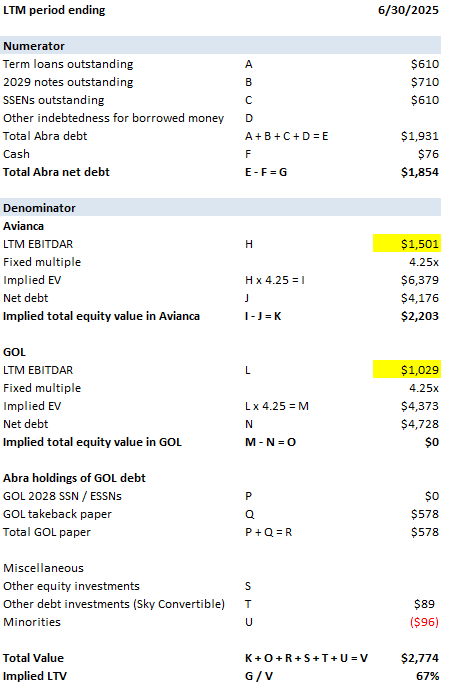 It’s at 67% currently, as you see above. The value is purely derived from Avianca and the value of the GOL paper. GOL equity contributes zero right now to the equation. If GOL defaults, then the value of the takeback paper drops, which would increase the LTV. Assuming GOL paper drops to zero, the LTV rises to 84%.