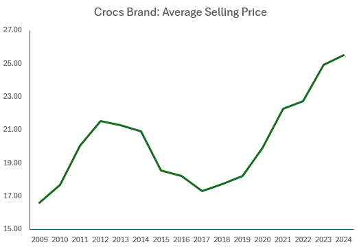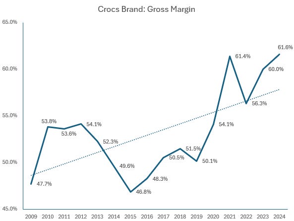 The Crocs brand gross margin rose from 47.7% in 2009 to 61.6% in 2024!