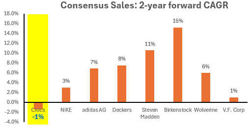 And while the company has been able to increase pricing on Hey Dude, the volume declines have been hard to swallow, with double-digit declines in 6 of the last 8 quarters. But perhaps it’s not so bad? If we assume that the COVID boost Hey Dude got wasn’t sustainable long-term, then the decline to a more normal rate makes sense. I have penciled in 22.5m pairs for 2025 for Hey Dude. That would imply a 4% CAGR from 2021 and a 29% CAGR from 2020. That compares to Crocs Brand 6% from 2021 and 14% from 2020, however, Crocs Brand has significantly higher volume (in 2020: 69m vs 6m for Hey Dude).