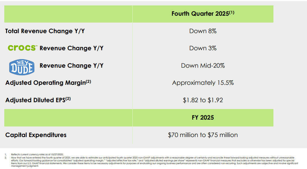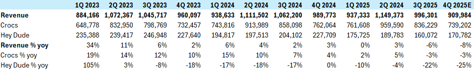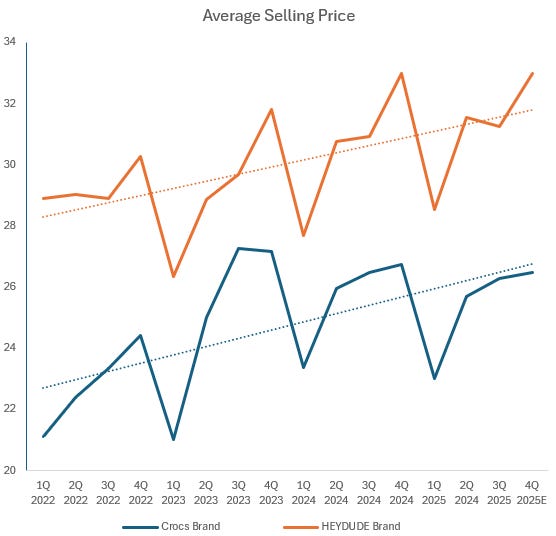 In Q4, I estimate flat pricing for Hey Dude, and c. -1% for Crocs. For volume, I have -25% for Hey Dude and -2% for Crocs. These estimates are based on the trend in pricing in volume. The company no longer reports pricing and volume in the 10-Qs like they used to, but there is management commentary around these, which can be used to come up with a best estimate.