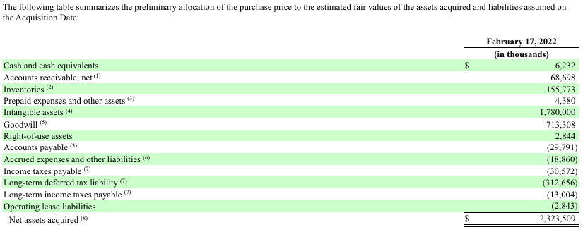 In Crocs’ 2022 10-K, we see that Hey Dude had $852m in revenues and $211m in operating income before corporate costs. (Note the incomplete year, as it was for the period starting February 17 and ending year-end.) The company’s corporate costs increased by $34.3m in that year. If we assume the entire increase was due to Hey Dude, then EBIT comes out to $177m. That’s a 21% margin. If we assume that margin on 2021 revenue of $570m, then Crocs was paying around c. 20x EV/EBIT. As the table below shows, there was little debt, so it was c. 20x P/EBIT as well ($2300 / (570 x 0.21).