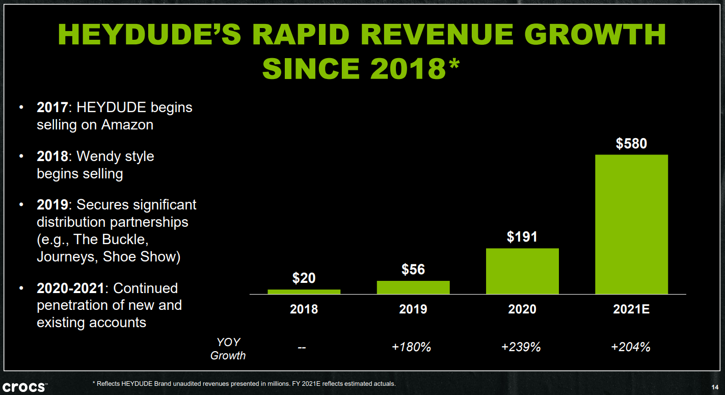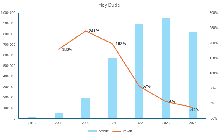 Crocs bought the Hey Dude brand for $2.3 billion. The acquisition was completed on February 17, 2022. The company paid 4x revenues. Considering the triple-digit growth rates, there was probably a little too much excitement surrounding the name. The market didn’t like the acquisition, and the stock dropped c. -12% when it was announced. Piper Sanders called it “one of the fastest rising brands”, and others liked the diversification aspect it brought to the company.