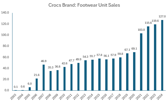 Crocs have only experienced 2 years of negative volume growth! Volume only fell in 2008 (Global Financial Crisis) by -25% and in 2016 -3%. So only 2 bad years out of 21. And while there was a positive bump during COVID, volume has continued to grow. I expect c. 130m pairs of Crocs to be sold in 2025.